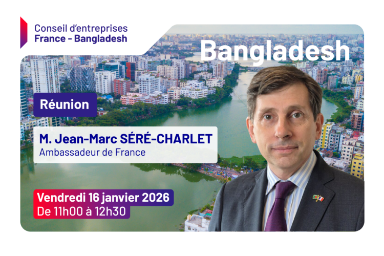 Le conseil d’entreprises France–Bangladesh de MEDEF International vous convie à une réunion autour de M. Jean-Marc Séré-Charlet, ambassadeur de France au Bangladesh.