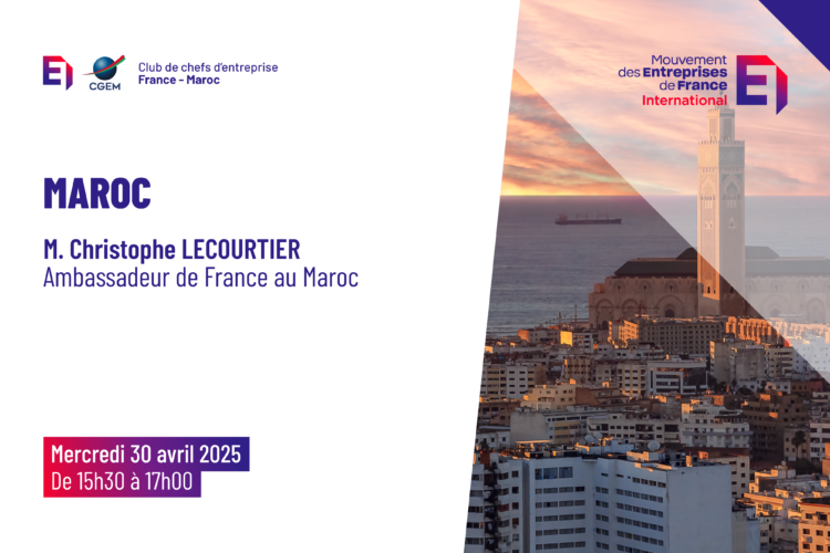 Le Club des chefs d’entreprises France-Maroc a le plaisir de vous convier à la réunion autour de S.E M. Christophe Lecourtier, Ambassadeur de France auprès du Royaume du Maroc. Cette rencontre a été présidée par M. Ross McInnes, Co-Président du Club des chefs d’entreprises France-Maroc et Président du Conseil d’administration de Safran.