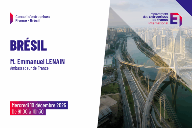 MEDEF International a le plaisir de vous convier à une réunion autour de M. Emmanuel LENAIN, Ambassadeur de France au Brésil, qui se tiendra le 10 décembre 2025, de 9h à 10h30, au 20 Av Rapp.