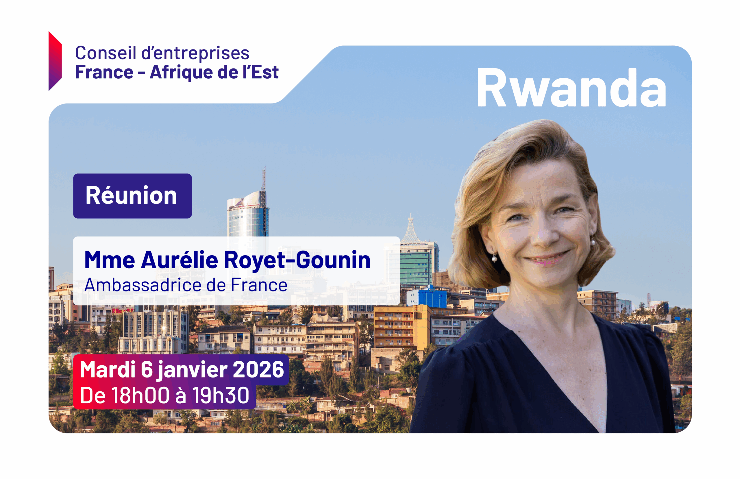 Le conseil d’entreprises France – Afrique de l’Est de MEDEF International vous invite à une réunion autour de Mme Aurélie ROYET-GOUNIN, ambassadrice de France au Rwanda, le mardi 6 janvier 2026 de 18h à 19h30, dans les bureaux de MEDEF International.