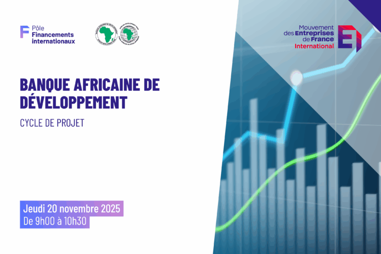 Le pôle Financements internationaux de MEDEF International vous invite à participer à une réunion de présentation des différents cycles d’un projet de la Banque africaine de développement, autour de Claire Camdessus, conseillère auprès de l’administrateur de la France à la BAfD, le jeudi 20 novembre, de 9h à 10h30 (heure française). Cette session sera présidée par Philippe Gautier, directeur générale de MEDEF International.