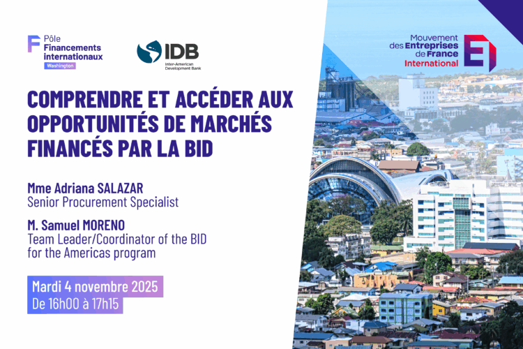 Le Bureau de Washington de MEDEF International a organisé, le mardi 4 novembre 2025, une réunion en ligne consacrée aux procédures de passation des marchés financés par la Banque interaméricaine de développement (BID).
