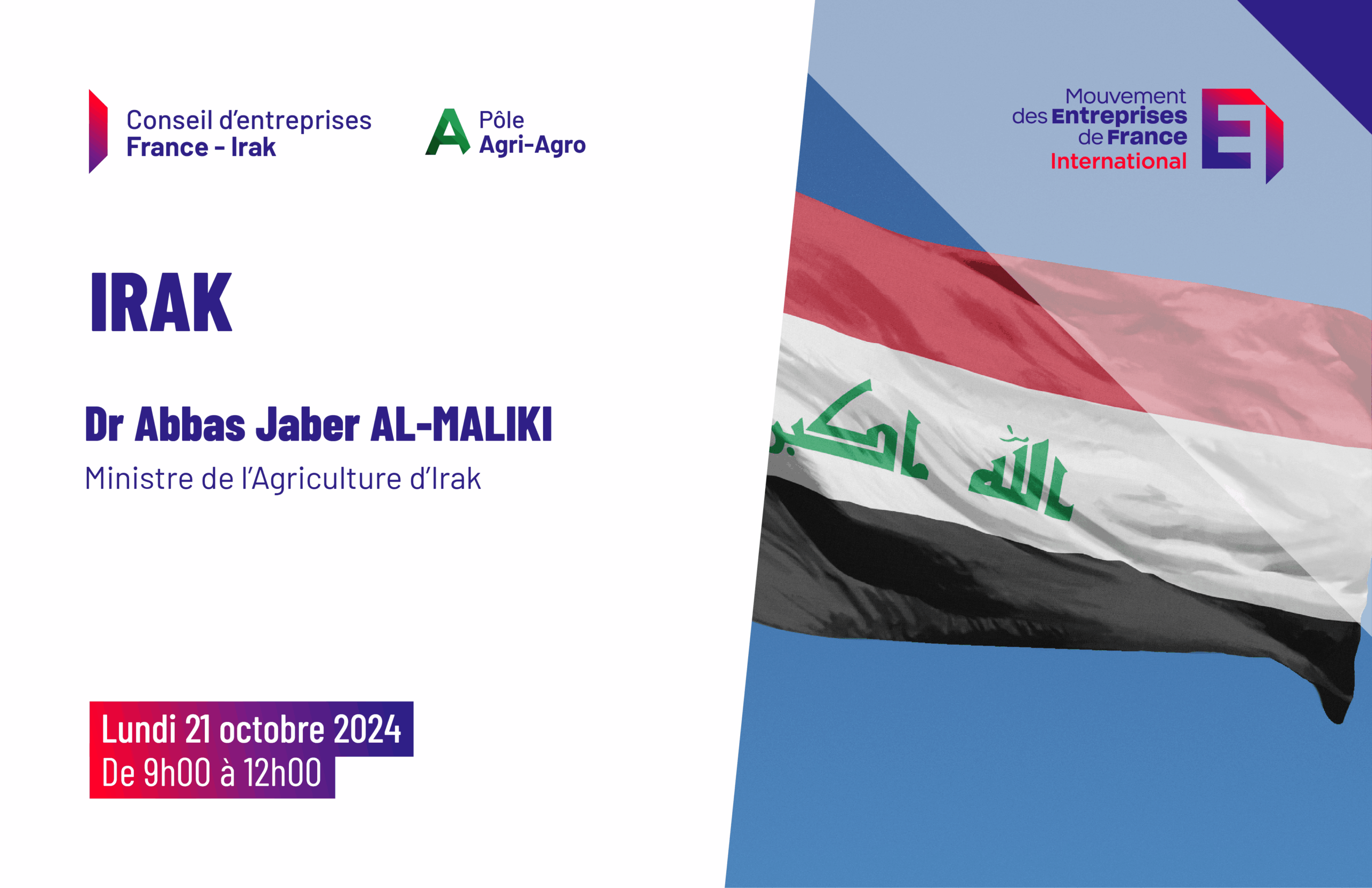 Le conseil d’entreprises France-Irak et le pôle Agricole et Agroalimentaire de MEDEF International ont organisé une rencontre autour du Dr. Abbas Jaber AL-MALIKI, ministre de l’Agriculture d’Irak, le lundi 21 octobre 2024. Cette séquence dédiée au secteur agricole et agroalimentaire s’est déroulée à l’Ambassade d’Irak en France.