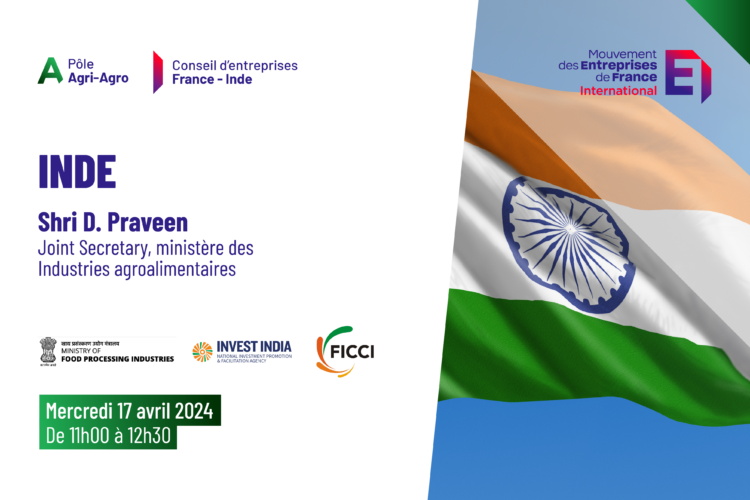 Le conseil d’entreprises France-Inde et le pôle Agricole et Agroalimentaire de MEDEF International a reçu Shri D. PRAVEEN, Joint Secretary auprès du ministre des Industries agroalimentaires de l’Inde (MoFPI), le mercredi 17 avril.