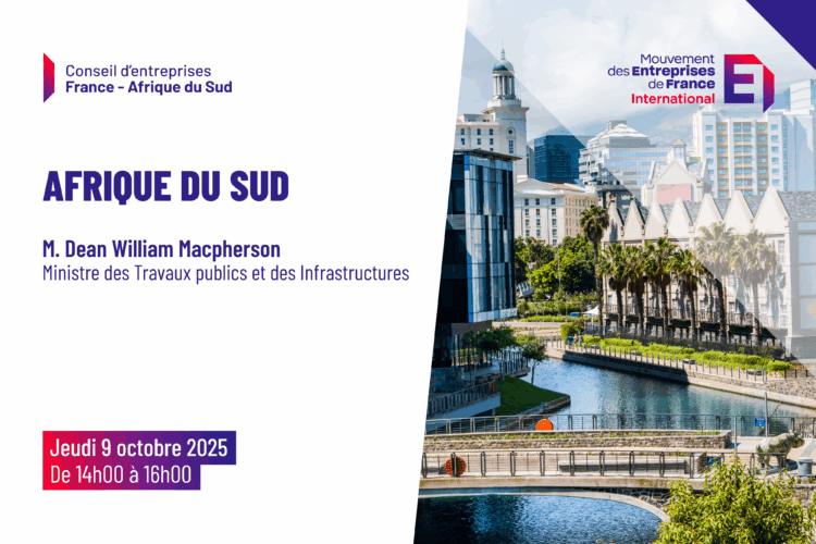 MEDEF International vous invite à prendre part à une réunion autour du Ministre des Travaux publics et des Infrastructures d’Afrique du Sud, Hon Dean William MACPHERSON , CE jeudi 9 octobre 2025, de 14h à 16h.