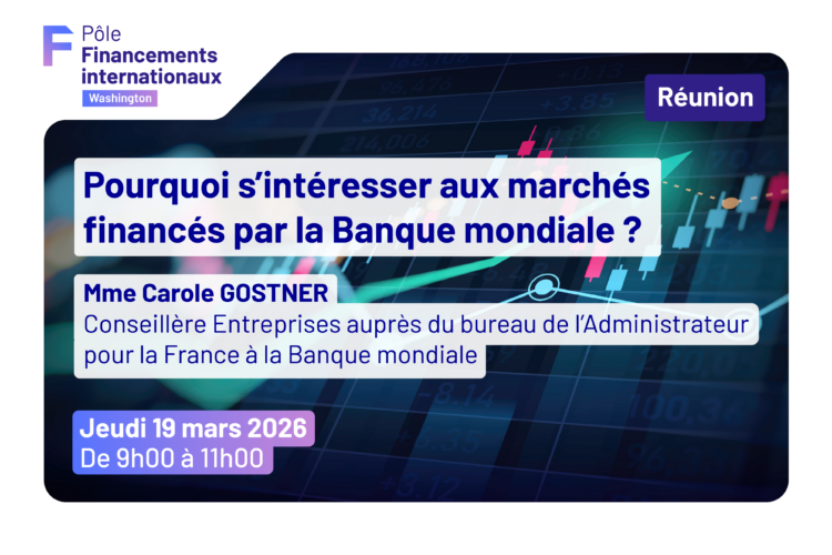 Le Bureau de Washington de MEDEF International vous invite à une réunion en présentiel autour de Mme Carole GOSTNER, conseillère Entreprises auprès du bureau de l’Administrateur pour la France à la Banque mondiale, dédiée à une introduction au fonctionnement et aux opportunités offertes par les marchés financés par la Banque mondiale.