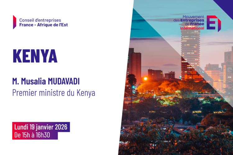 Le conseil d’entreprise France – Afrique de l’Est de MEDEF International vous invite à prendre part à une réunion autour de M. Musalia MUDAVADI, Premier secrétaire du Cabinet du Kenya, qui se tiendra le lundi 19 janvier 2026, de 15h à 16h30 dans les bureaux de MEDEF International (20 Avenue Rapp).