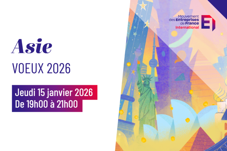 A l’occasion de la nouvelle année, MEDEF International organise l’édition 2026 des Vœux Asie, le jeudi 15 janvier 2026 à partir de 19h00. Nous aurons le plaisir d’accueillir nos présidents de conseil de la région, les ambassadeurs du continent basés à Paris, des institutions publiques françaises, et des partenaires et représentants d’entreprises françaises membres de MEDEF International.